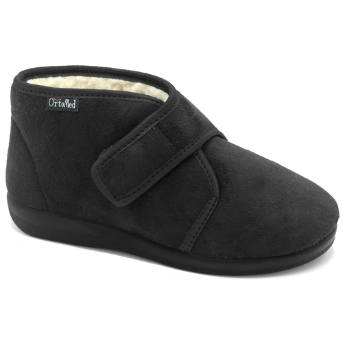 Pantufa botim com fecho em tira de velcro com forro a pêlo de lã natural.